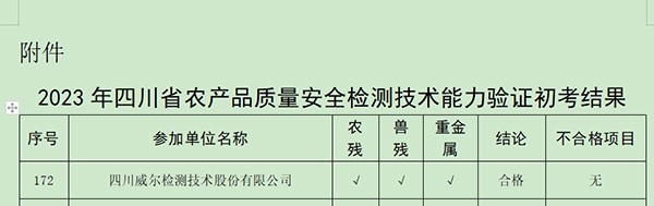 四川威爾檢測順利通過2023年四川省農(nóng)產(chǎn)品質(zhì)量安全檢測技術(shù)能力驗(yàn)證