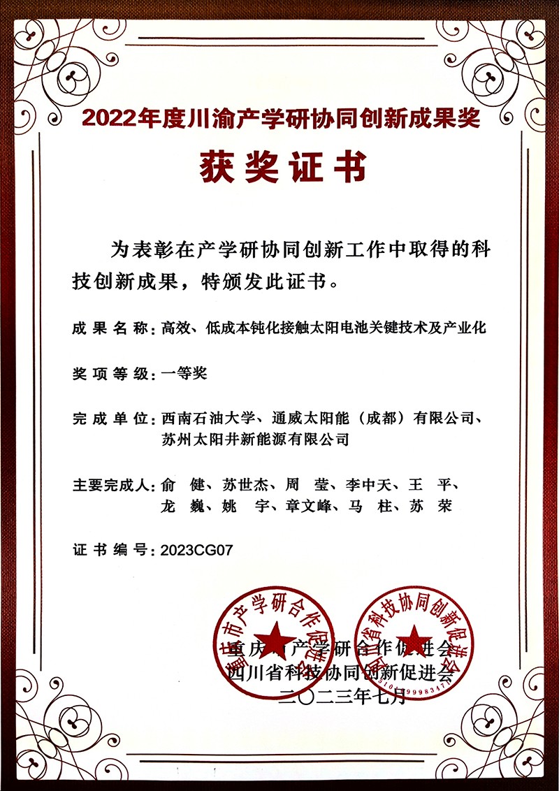 通威太陽能榮獲“2022年度川渝產(chǎn)學(xué)研協(xié)同創(chuàng)新成果獎(jiǎng)”一等獎(jiǎng)