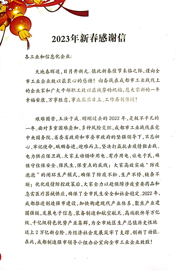 成都制造強市領導小組辦公室發(fā)來感謝信鼓勵通威太陽能再創(chuàng)佳績
