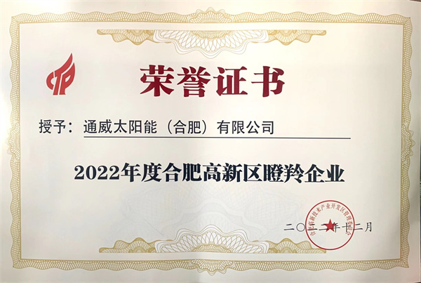 通威太陽能(合肥)有限公司榮獲2022年度合肥高新區瞪羚企業稱號