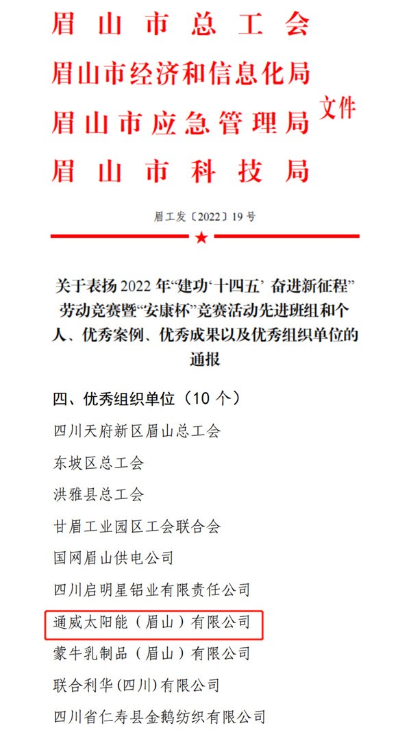 通威太陽能眉山基地榮獲眉山市總工會2022年勞動競賽優秀組織單位等多項榮譽