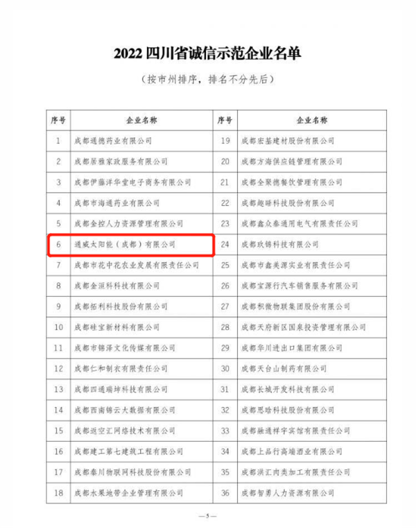 通威太陽能榮獲“2022四川省誠信示范企業”稱號