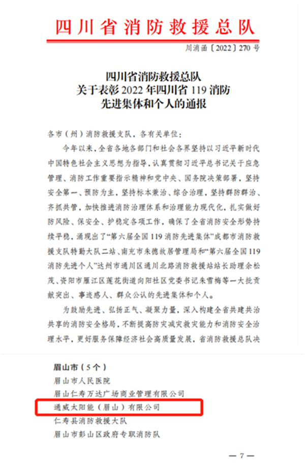 通威太陽能眉山基地榮獲“四川省119消防先進集體”稱號