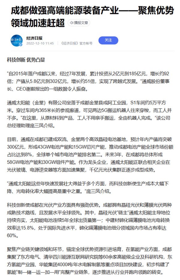 經濟日報聚焦通威太陽能金堂基地科技創新亮眼表現