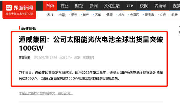 人民網(wǎng)、中國新聞網(wǎng)等主流媒體聚焦通威太陽能光伏電池全球出貨量突破100GW