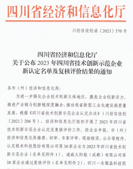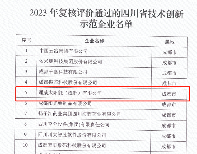 近日,四川省經濟和信息化廳公布了2023年省技術創新示范企業認定及復核通過名單,通威太陽能雙流基地憑借在科技創新領域的強勁實力順利通過“2023年省技術創新示范企業”復核。