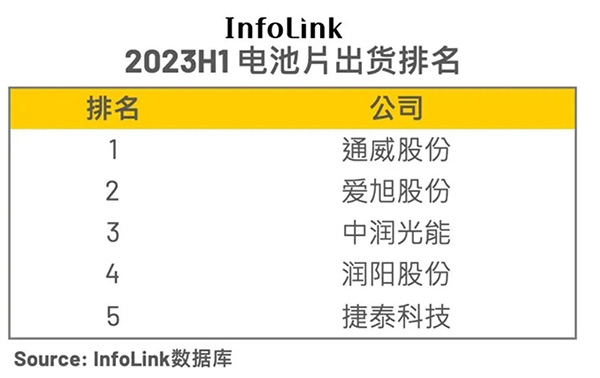 8月28日,InfoLink 2023上半年電池片出貨排名新鮮出爐,通威電池片出貨量依然穩(wěn)居排行榜第一。