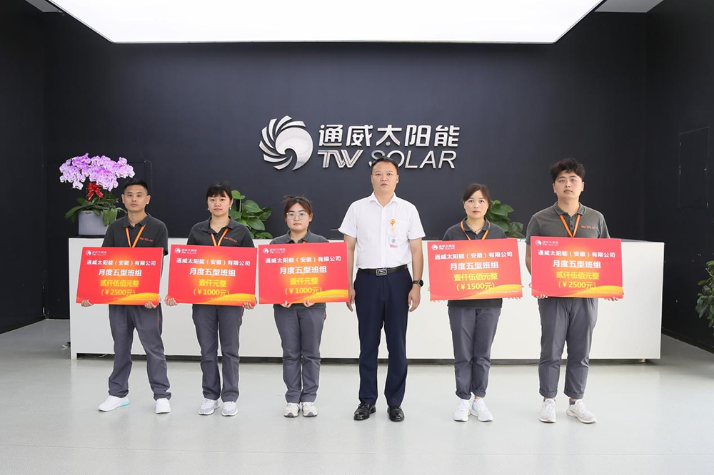 為全面提升一線班組的凝聚力、戰(zhàn)斗力,建設(shè)技能型、效益型、管理型、創(chuàng)新型、和諧型的五型太陽(yáng)能制造團(tuán)隊(duì),同時(shí)為培養(yǎng)標(biāo)桿,樹立典范,激勵(lì)全體班組不斷進(jìn)步、不斷超越,持續(xù)營(yíng)造比、學(xué)、趕、幫、超的良好團(tuán)隊(duì)氛圍。8月,通威太陽(yáng)能順利開展7月月度五型班組表彰活動(dòng),通威太陽(yáng)能各基地負(fù)責(zé)人出席頒獎(jiǎng)活動(dòng)分別為各優(yōu)秀班組頒發(fā)榮譽(yù)。