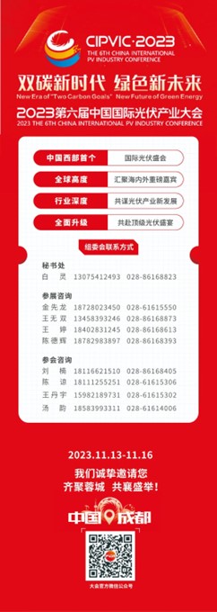 為貫徹落實新發(fā)展理念,展示光伏行業(yè)創(chuàng)新發(fā)展成果,推動我國新能源產業(yè)高質量發(fā)展,并結合加大清潔能源開發(fā)利用,推進水風光儲氫多能互補一體化發(fā)展,加快建設全國優(yōu)質清潔能源基地和國家清潔能源示范省,以及在全國推進光伏產業(yè)集群式發(fā)展,2023第六屆中國國際光伏產業(yè)大會將于11月13日-16日在成都隆重舉行。