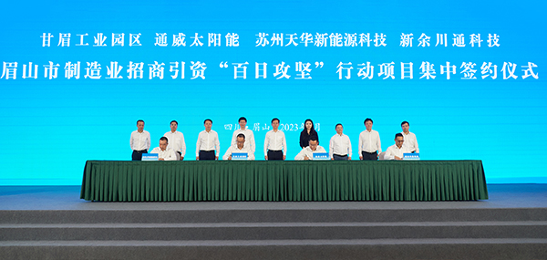 7月10日,眉山市制造業(yè)招商引資“百日攻堅(jiān)”行動(dòng)項(xiàng)目集中簽約儀式舉行。眉山市委書(shū)記胡元坤,市委副書(shū)記、市政府市長(zhǎng)黃河,市委常委、市政府常務(wù)副市長(zhǎng)孫劍,市委常委、統(tǒng)戰(zhàn)部部長(zhǎng)魯力,市政府副市長(zhǎng)鄒汝林和市政府相關(guān)部門(mén)負(fù)責(zé)人出席會(huì)議。眉山天府新區(qū)、各縣(區(qū))相關(guān)工作負(fù)責(zé)人,甘眉工業(yè)園區(qū)黨工委、管委會(huì)班子成員及相關(guān)部門(mén)負(fù)責(zé)人參加會(huì)議。通威股份董事長(zhǎng)、CEO劉舒琪,通威太陽(yáng)能總經(jīng)理周華,副總經(jīng)理宋梟作為簽約企業(yè)代表受邀出席,并與甘眉工業(yè)園區(qū)正式簽署了《通威太陽(yáng)能有限公司16GW高效晶硅電池項(xiàng)目投資協(xié)議書(shū)》。