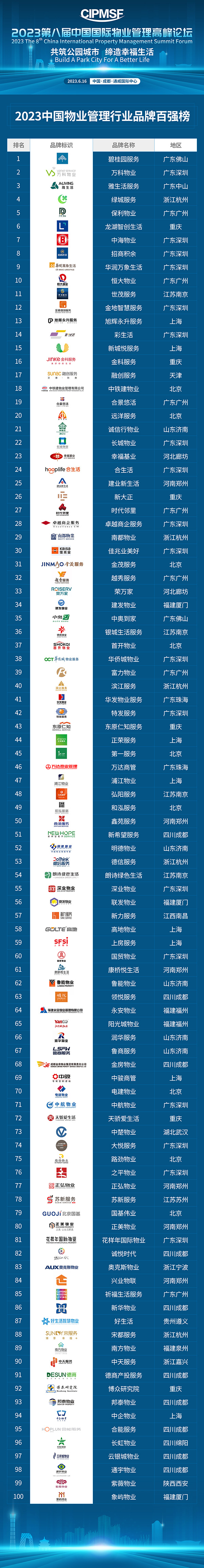 為積極助推中國物業品牌建設,將品牌建設作為改善物業服務、著力推動物業管理行業高質量發展的動力,本屆論壇重磅發布“2023中國物業管理行業品牌百強榜”。根據國家品牌評價標準,論壇組委會從管理規模、經營績效、服務質量、發展潛力、社會責任5項一級指標和行業性質、項目關聯度、品牌投入、口碑評價、吸納就業等24項二級指標,同時圍繞人均效能、元均效能、坪均效能、費均效能、城市效能、項目效能六個研究領域,對品牌強度進行分析評審,并綜合專家組意見形成最終排名。碧桂園服務、萬科物業、雅生活服務等100個品牌榮列榜單。