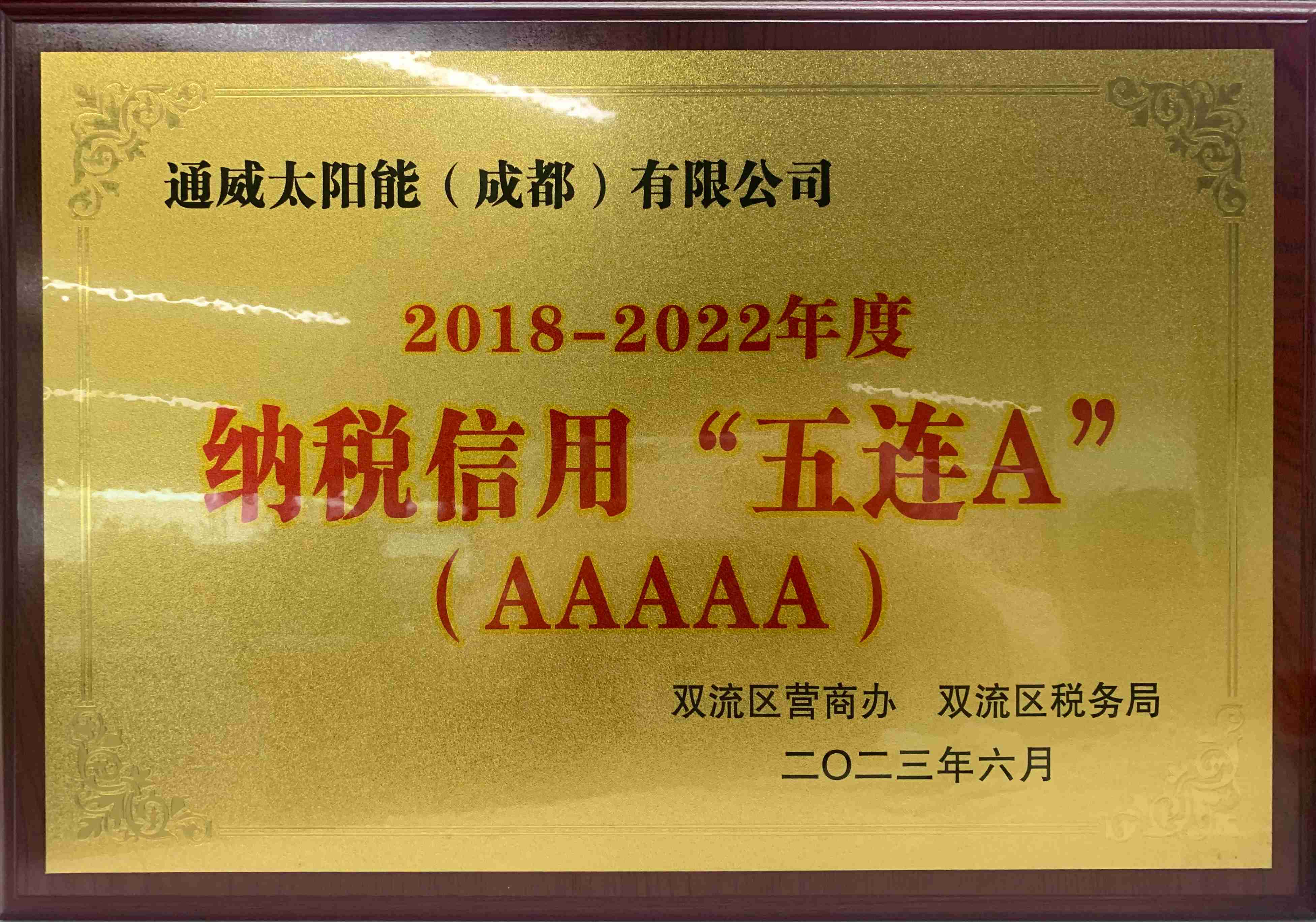 近日,國家稅務總局公布了2022年納稅信用A級納稅人名單,通威太陽能雙流基地再次被評為“A級納稅人”。至此,通威太陽能雙流基地連續八年榮膺“A級納稅人”稱號,雙流區稅務局聯合雙流區營商辦為我司頒發了“五連A”獎牌,以示表彰。