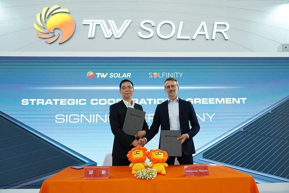 通威股份光伏商務部組件全球營銷總經理邱新與Solfinity CEO Waldemar Bajbak代表雙方簽約。