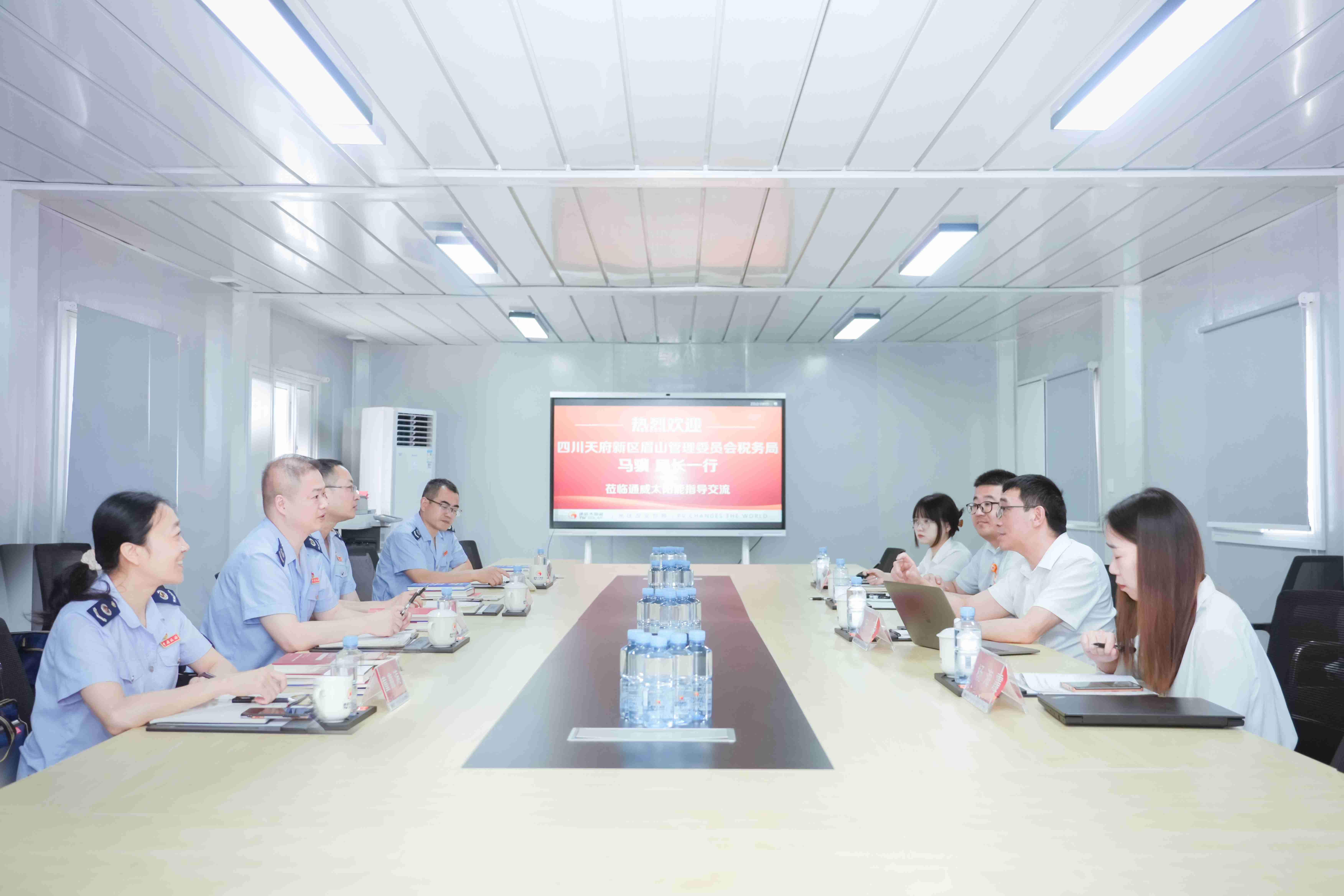 6月14日,眉山管理委員會稅務(wù)局局長馬驥一行蒞臨通威太陽能彭山基地指導交流,通威太陽能副總經(jīng)理宋梟攜彭山基地財務(wù)負責人熱情接待并座談。