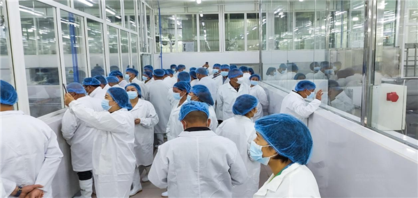 來賓一行首先考察了通威(成都)水產食品有限公司,成都水產總經理楊紅帶領生產、研發團隊熱情接待,來賓一行通過對生產工廠和研發室的實地考察,對通威食品工廠的標準化品質管理和食品安全生產的把控高度贊揚。