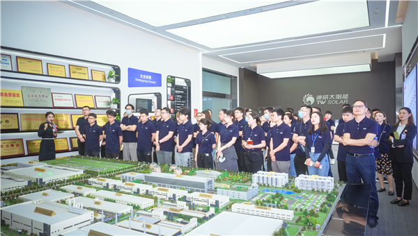 交流團一行先后參觀了公司智能制造展廳及黨工路線區。在通威太陽能智能制造體驗中心,交流團一行詳細了解通威太陽能發展歷程、產能規模、企業榮譽情況及戰略布局等情況,對公司的標準化、信息化、精細化管理給予高度肯定。在紅色聚能家黨工路線參觀過程中,交流團一行對通威太陽能職工之家的建設展現濃厚興趣,并表示通威太陽能豐富多彩的文創產品和文化建設值得借鑒。
