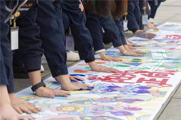 在員工簽署環(huán)節(jié),來自各基地各廠部的200余名員工代表匯集在定制的彩色長卷四周,將代表“陽光”“正向”的彩色印泥按在手掌,印在長卷。長卷以“效率優(yōu)先 陽光正向 監(jiān)督保障”為主題,融合通威太陽能各基地標(biāo)志建筑、陽光仔等圖案,寓意通威太陽能全體員工將以集團(tuán)為引領(lǐng),將通威文化、通威精神傳遞落實(shí)到生產(chǎn)、生活各個(gè)層面,真正做到將企業(yè)文化內(nèi)化于心、外化于行、知行合一,最終助力生產(chǎn)經(jīng)營,為集團(tuán)和公司的穩(wěn)健發(fā)展注入源源不斷的動(dòng)力。