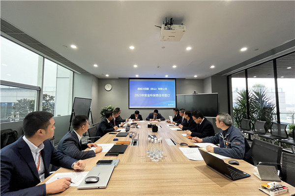 2月19日,通威太陽能彭山基地2023年度公司級安全環保責任書簽訂儀式成功舉行,通威太陽能安徽公司總經理助理兼彭山基地項目執行指揮長顧峰攜彭山基地各部門主要負責人參會。