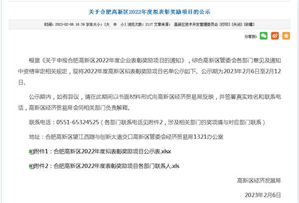 合肥高新區(qū)2022年度擬表彰獎(jiǎng)勵(lì)項(xiàng)目的公示文件