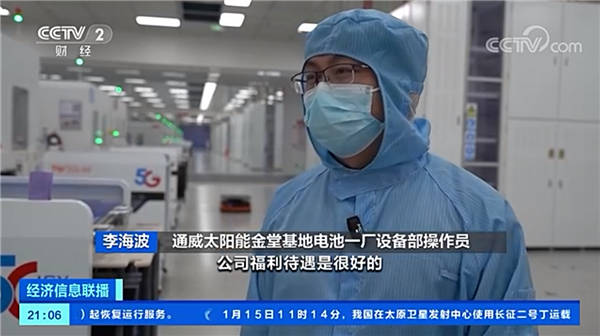 《央視財經》報道指出:熱火朝天的生產場景正在上映,數百臺智能小車來回穿梭運輸物料,一片片灰色硅片經過制絨、刻蝕、鍍膜等工序成為電池片。當問到春節期間留班人員福利待遇時,通威太陽能金堂基地總經理助理龐三鳳說道:“春節期間會結合我們實際生產的情況進行輪班,對留崗員工有一些福利,除夕到初二這三天每天人均是五百塊錢,初三和初四,除了兩倍工資之外,還有三百塊錢的一個補貼?!崩詈2ㄊ窃O備維護崗的一位操作員,聽說工廠今年春節不停產后,他主動申請留崗加班,他告訴記者,自己是本地人,回家比較方便,再加上公司額外的補貼比較高,準備這段時間把錢掙夠,等工友們回來后,自己再錯峰休假。