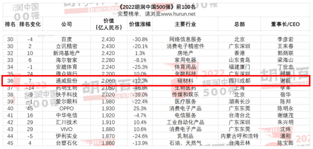 1月13日,胡潤研究院正式發布《2022胡潤中國500強民營企業》榜單。其中,通威股份憑借多晶硅和電池片兩大領域發展的實力,位列榜單36位,排名較上一年提升了7位,充分展現了通威在復雜多變的經濟形勢下持續穩健的發展態勢。