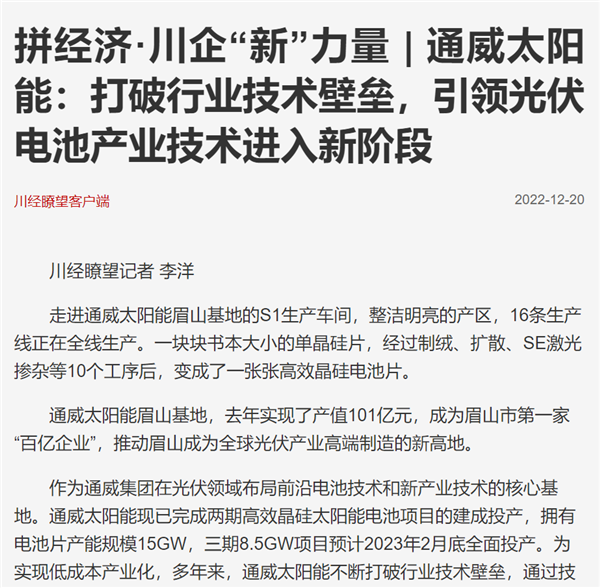 12月20日,四川經(jīng)濟日報發(fā)表題為“拼經(jīng)濟·川企‘新’力量|通威太陽能:打破行業(yè)技術(shù)壁壘,引領(lǐng)光伏電池產(chǎn)業(yè)技術(shù)進入新階段”的報道,聚焦通威太陽能在技術(shù)領(lǐng)域的創(chuàng)新與發(fā)展。