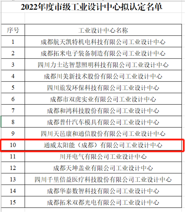 近日,由成都市經(jīng)濟(jì)和信息化局組織開(kāi)展的2022年成都市認(rèn)定工業(yè)設(shè)計(jì)中心工作順利結(jié)束,并公布了“2022年成都市市級(jí)工業(yè)設(shè)計(jì)中心名單”,通威太陽(yáng)能雙流基地榮列其中,這是公司首次獲得“工業(yè)設(shè)計(jì)中心”方面的權(quán)威認(rèn)證。
