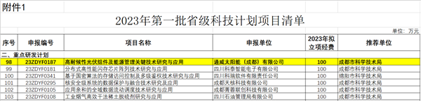 近日,四川省科學技術廳發布了2023年第一批省級科技計劃和農業科技成果轉化、育種攻關項目的公示,通威太陽能雙流基地聯合西南石油大學、西華大學、攀枝花學院攻關的“高耐候性光伏組件及能源管理關鍵技術研究與應用”項目成功申報為省科技計劃項目-重點研發計劃項目。