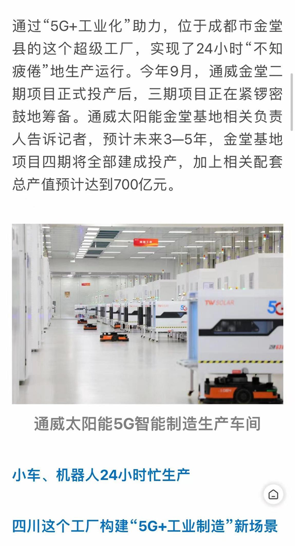 11月2日,《封面新聞》刊發(fā)文章《探秘全球光伏行業(yè)首個(gè)5G超級(jí)工廠 如何將生產(chǎn)效率提升約161%?|決戰(zhàn)四季度 大干一百天》,聚焦通威太陽能金堂基地高質(zhì)量發(fā)展。