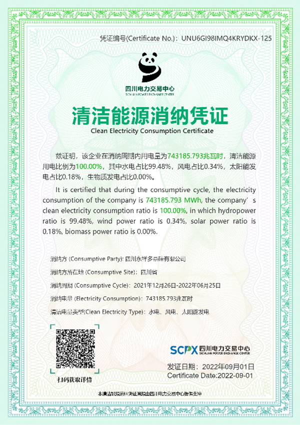 把碳足跡核算清楚,是企業掌握自身碳排放家底、推動綠色低碳循環發展的首要前提。永祥生產高純晶硅,制造階段的能源消耗主要為外購電力,永祥始終堅持綠色發展,積極采購可再生能源電力,2022年上半年,在四川省主管部門、四川電力交易中心支持下,獲得了四川電力交易中心經省級政府部門授權出具的、有公信力的全省首張清潔能源消納憑證。該憑證以電力市場化交易合同數據和結算數據為依據,精確溯源了企業使用電量來源、類型及占比,憑證表明永祥清潔能源用電比例為100%。