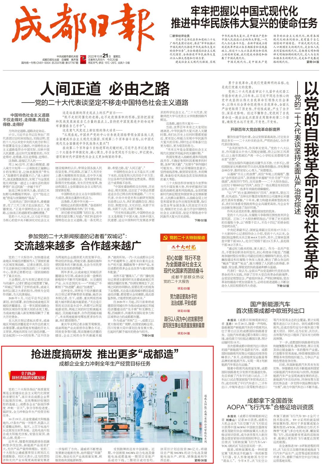 黨的二十大報告指出“高質量發(fā)展是全面建設社會主義現代化國家的首要任務”,連日來在成都企業(yè)界引起強烈反響。10月21日,《成都日報》以“搶進度搞研發(fā) 推出更多成都造”為題的報道,聚焦通威太陽能金堂基地高效生產情況。