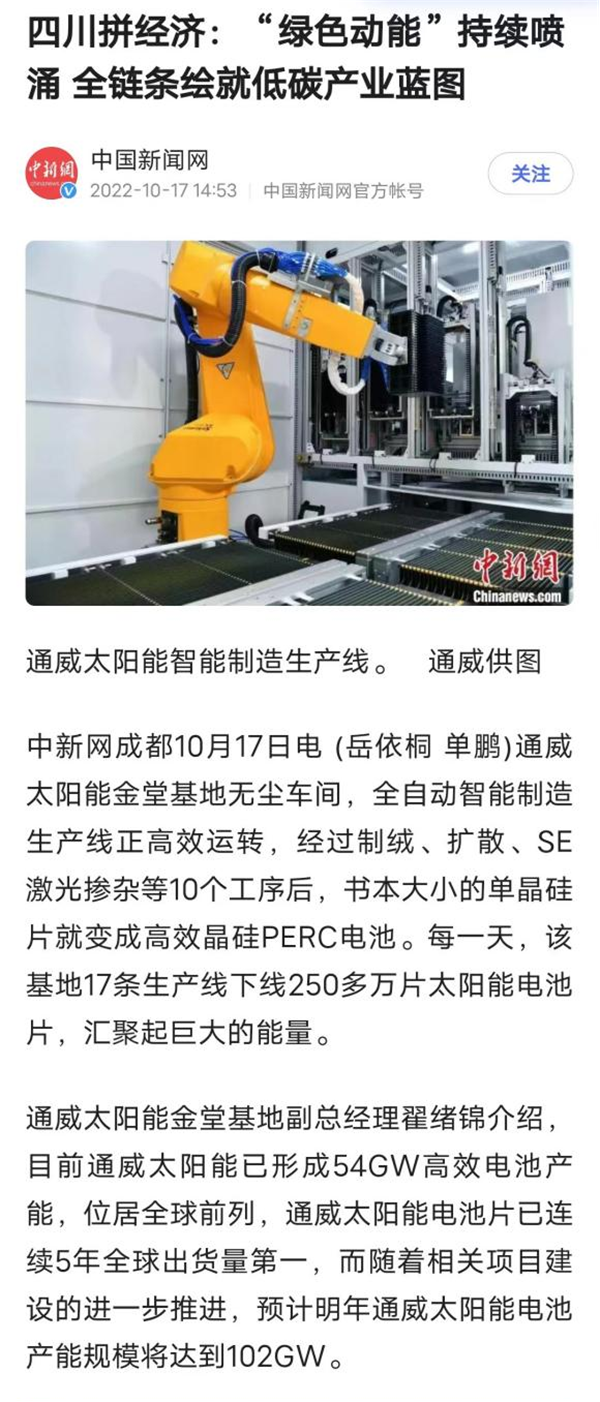 10月17日,中國新聞網(wǎng)發(fā)表題為《四川拼經(jīng)濟(jì):“綠色動能”持續(xù)噴涌 全鏈條繪就低碳產(chǎn)業(yè)藍(lán)圖》的文章,聚焦通威太陽能金堂基地的綠色低碳高質(zhì)量發(fā)展。