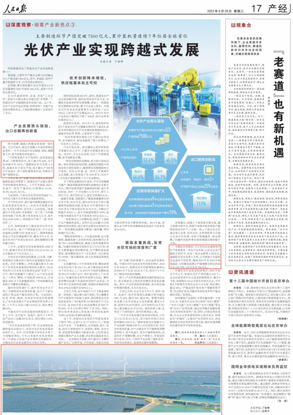 9月28日,《人民日報》以《光伏產業實現跨越式發展》為題,深度報道我國光伏產業發展。作為中國光伏企業代表,通威智能制造和綠色發展領先實力獲得關注。