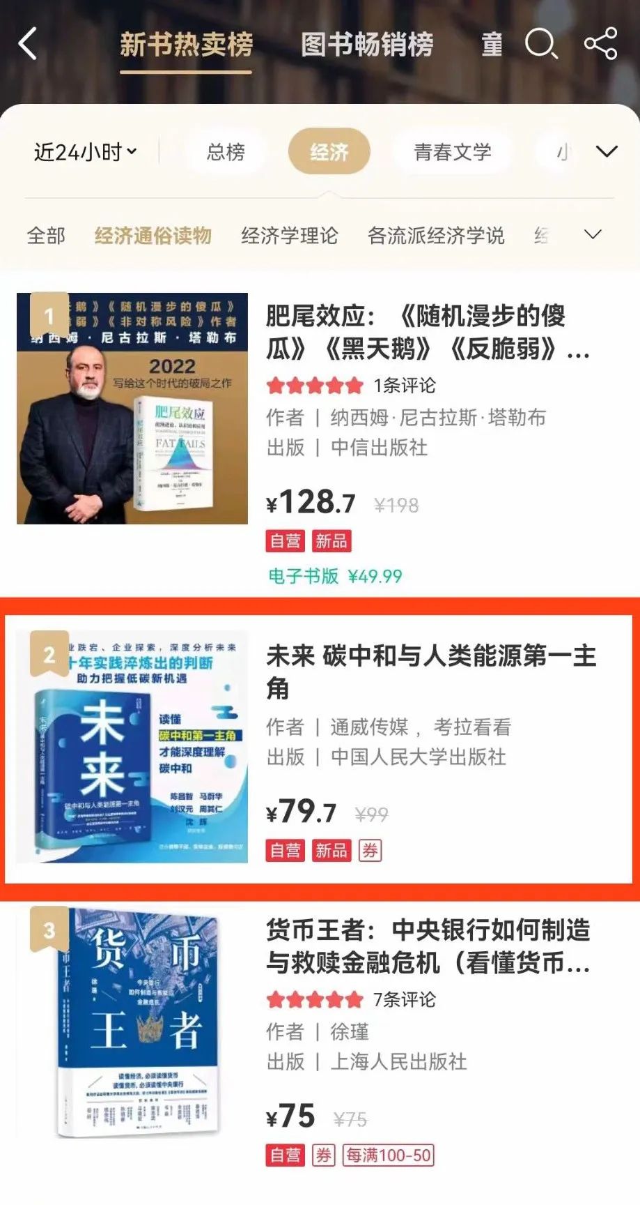 書籍在中國人民大學出版社書店上架 陳昌智委員長在推薦序中表示,實現“雙碳”并非一蹴而就,這是一場廣泛而深刻的經濟社會系統性變革。本書既是中國光伏產業跨越式發展的寫照,也是對中國實現碳中和目標的思考,更是對全球積極應對氣候危機和能源變革的倡議。 劉漢元主席在序言中表示,隨著光伏的成本進一步降低,以及中國經濟和光伏產業自身的良性發展,中國的碳達峰、碳中和目標有可能在各方的共同努力下提前 5~10 年實現,光伏產業將迎來廣闊的市場空間,光伏發電也將成為碳中和道路上的第一能源。 沈輝教授在序言中指出,本書詳細敘述了未來光伏產業在技術、機制及資本上可能存在的大膽創新,并將這些寶貴的思考與案例悉數分享,這是一場與整個新能源產業界的隔空對話和思想碰撞。 書籍登上當當新書熱賣榜——經濟類總榜第2名 書籍正式出版后,已經在線上及線下銷售渠道全網發布,包括當當、京東、天貓等渠道平臺,以及全國各地文軒書店、新華書店等線下渠道,以及微信讀書、掌閱、學習強國、咪咕、網易等各類線上數字閱讀平臺,多渠道與廣大讀者見面,進一步普及碳中和背景下加快光伏產業發展的必要性,在社會各界凝聚更廣泛共識。 作為中國乃至全球光伏新能源產業發展的核心參與者和主要推動力量之一,多年來,通威以“光伏改變世界”為核心理念,堅定不移發展光伏產業。未來,通威也將心懷使命,向光而行,為助推碳中和目標實現,為全人類可持續發展貢獻通威力量!