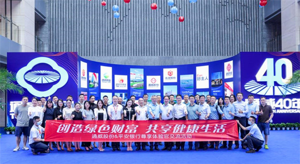 8月30日,通威股份和平安銀行聯合策劃組織的“創造綠色財富,共享健康生活”第11期尊享體驗官交流活動在通威國際中心隆重舉行。平安銀行成都分行行長高峰、副行長張建昌帶領20余位平安銀行尊享體驗官蒞臨通威參觀交流。通威股份副董事長嚴虎、財務總監周斌熱情接待并座談,通威食品總經理陳波,通威股份財務部部長助理甘露,通威全農惠總經理王珊陪同接待。