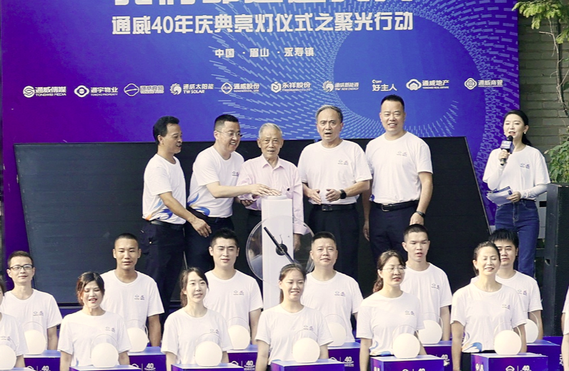 在現場所有人的共同見證下,劉老太爺按下按鈕,啟動通威太陽能發電裝置,吸收通威起源地的清晨第一縷陽光,通過現場的小型太陽能離網式光伏發電裝置實時發出的清潔電力,聚起通威40年慶典的第一束光,并點亮代表通威各產業、各板塊的40盞聚光燈,正式拉開通威40年慶典亮燈儀式的序幕。