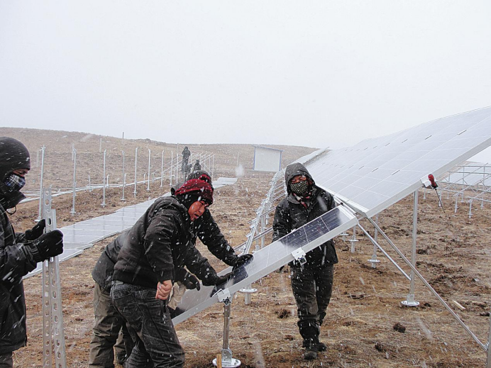 ▲理塘縣若拉村,通威項目組建設(shè)人員頂著風(fēng)雪安裝光伏板
