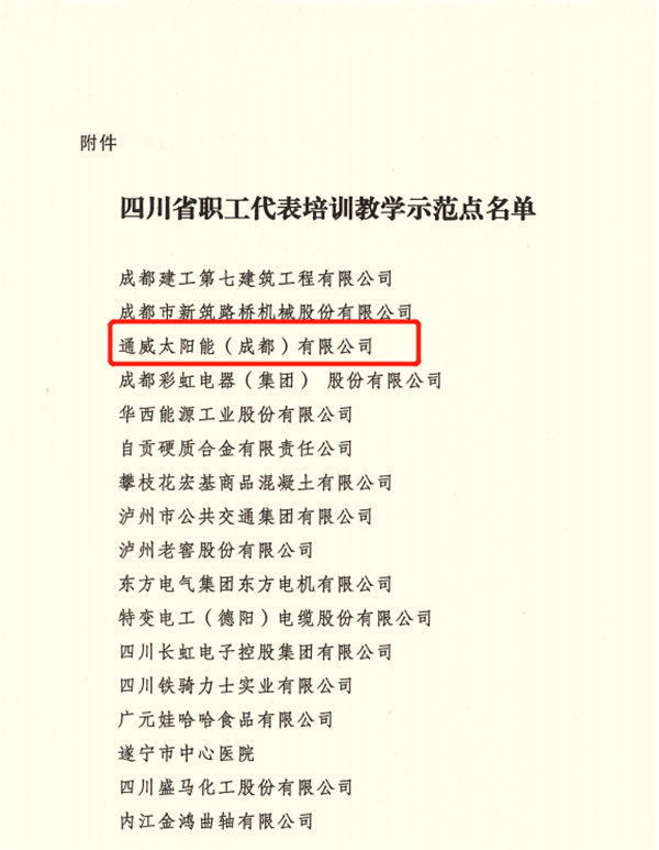 通威太陽(yáng)能雙流基地榮列省職工代表培訓(xùn)教學(xué)示范點(diǎn)名單
