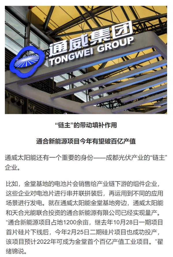 報道指出,“如果把目光擴(kuò)大到成都乃至整個四川,不難發(fā)現(xiàn),以雙流和金堂為核心承載,以通威太陽能等企業(yè)為代表的千億級光伏產(chǎn)業(yè)集群正初露崢嶸;通威太陽能還有一個重要的身份——成都光伏產(chǎn)業(yè)的“鏈主”企業(yè)。來自成都市生態(tài)環(huán)境局的數(shù)據(jù)顯示,目前成都光伏產(chǎn)業(yè)規(guī)模已近200億元,以雙流和金堂為核心承載,集聚通威太陽能等20余家重點(diǎn)企業(yè)?!眻蟮缹νㄍ柲芗せ罹G色動能,發(fā)揮光伏行業(yè)領(lǐng)頭羊的虹吸作用,加快發(fā)展綠色低碳產(chǎn)業(yè)集群表示高度肯定。