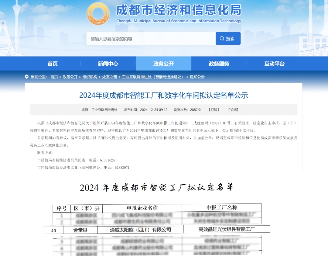 通威太陽能(四川)有限公司獲評(píng)2024年度成都市智能工廠