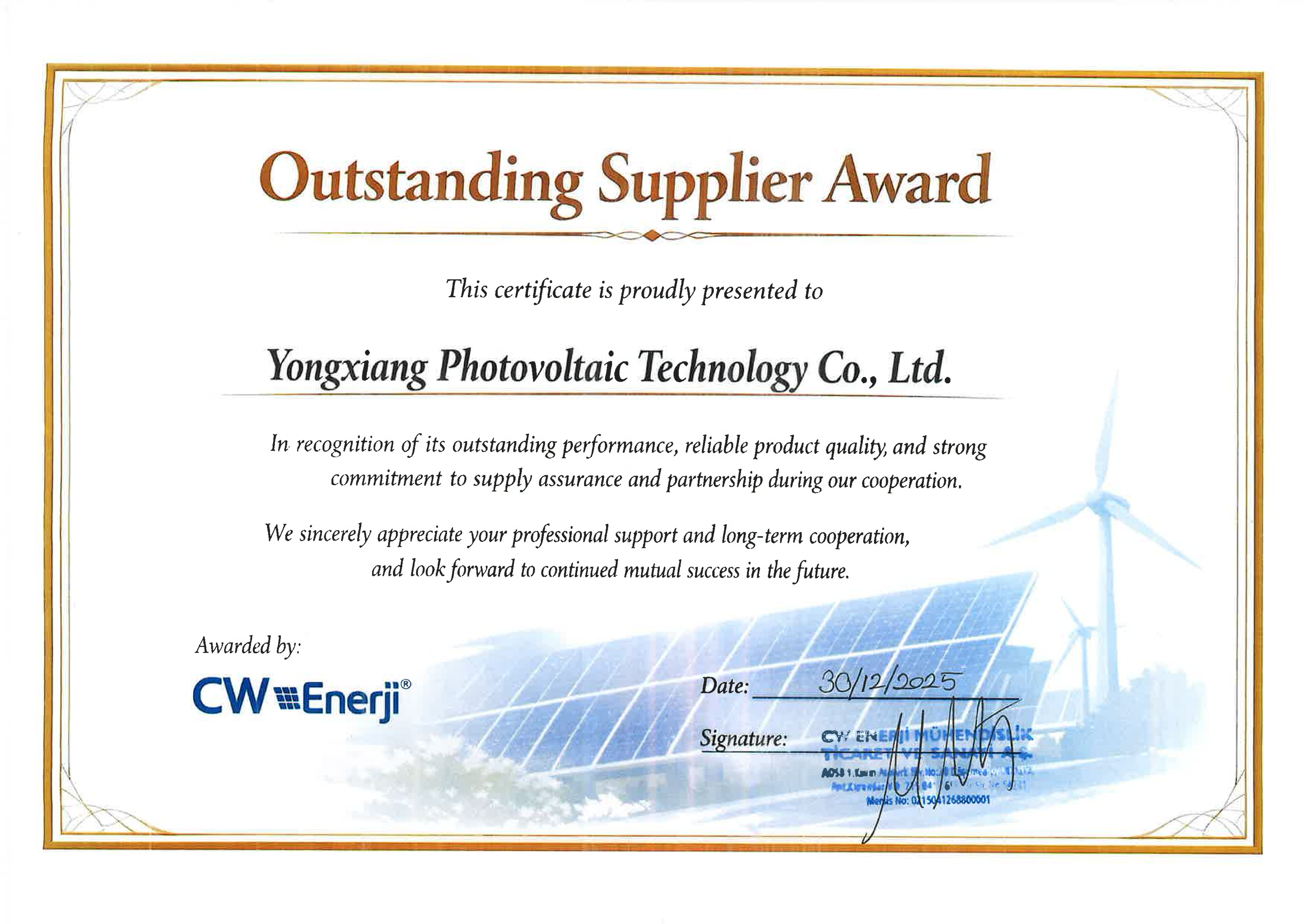 永祥光伏科技獲評(píng)土耳其CW公司年度優(yōu)秀供應(yīng)商獎(jiǎng)