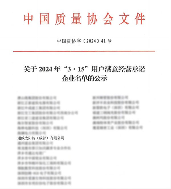 通威太陽能(成都)有限公司榮獲中國質量協會“3·15”用戶滿意經營承諾企業稱號