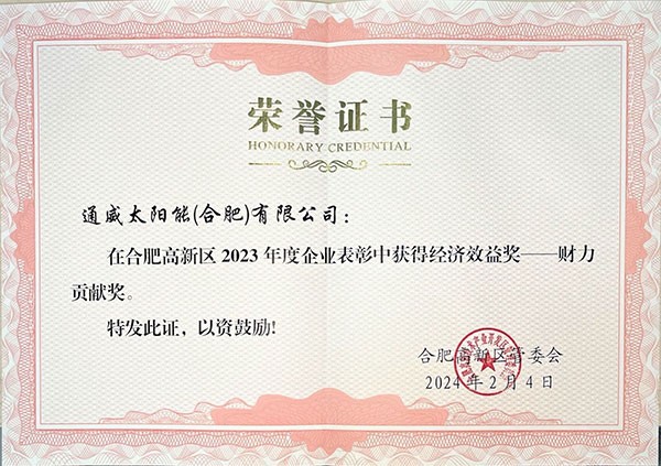 通威太陽能(合肥)有限公司 榮評(píng)2023年度合肥高新區(qū)優(yōu)秀企業(yè)