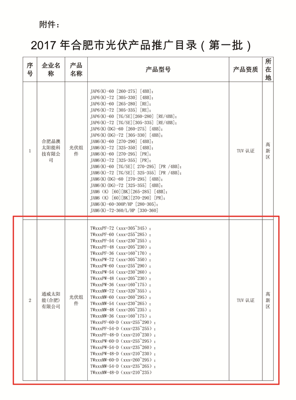 通威太陽能(合肥)有限公司成功入列《2017年合肥市光伏產品推廣目錄》