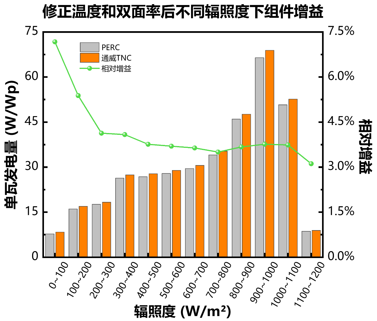 根據IEC61853相關規定,分析全年不同輻照度下的發電量數據,通威TNC組件在所有輻照度下均具有更優的發電性能,特別是在低輻照條件下增益更加明顯,弱光性能更佳。