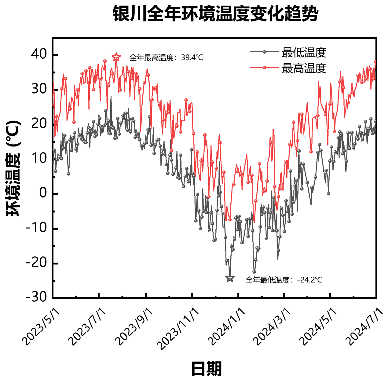 位于寧夏回族自治區銀川市的CPVT戶外實證基地(經度:106.23°E,緯度:38.49°N),屬于溫帶大陸性氣候。固定傾角支架年均陣列面累計輻照度為1971.2kWh/㎡,年均降水量為200-700mm,年紫外(UVA和UVB)輻照量約為年總輻射量的5%,全年平均氣溫14.56℃,最低氣溫-24.2℃,最高氣溫39.4℃。