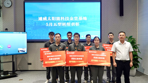 為推動班組文化建設,明確班組建設的方向和目標,樹立榜樣力量。近日,通威太陽能科技合肥、鹽城、金堂基地分別舉行5月月度五型班組表彰活動。通威太陽能(鹽城)有限公司副總經理翟緒錦,通威太陽能(四川)有限公司總經理助理朱劍誠,通威太陽能(合肥)有限公司總經理助理李冬生,通威太陽能科技有限公司總經理助理葉龍出席活動并為獲獎班組頒發獎牌。
