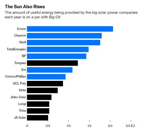 按年度產出的有用能量計算,目前最大的多晶硅生產商通威,已可以與英國石油公司、埃尼公司和康菲石油等一些最大的歐美石油公司正面交鋒,而其他一些電池板制造商也不算落后太多。如果通威繼續執行去年12月份宣布的計劃,在內蒙古建設一座40萬噸的高純晶硅項目及配套設施,將其目前的產量提高近一倍,那么它甚至有可能超過歐美石油行業的“老大哥”埃克森美孚:
