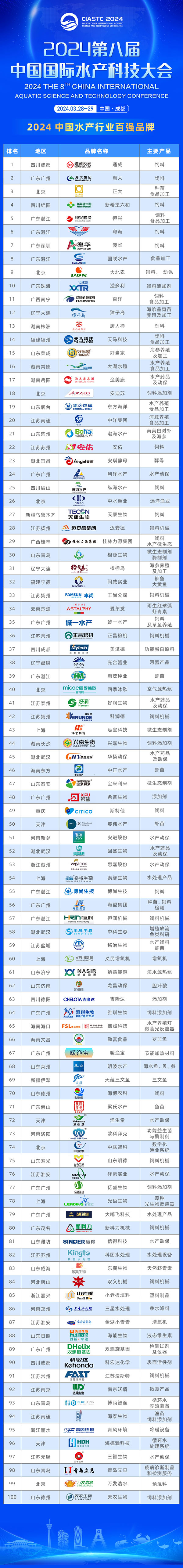 3月28-29日,2024第八屆中國國際水產(chǎn)科技大會在成都通威國際中心隆重舉行。作為大會重要環(huán)節(jié)之一,“2024中國水產(chǎn)行業(yè)百強品牌”全球首發(fā)。