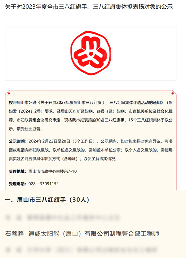 為表揚在新時代為眉山現代化建設各項事業發展中取得優異成績、做出突出貢獻的優秀女性,激勵帶動廣大婦女在新時代新征程眉山現代化建設中貢獻巾幗力量,眉山市婦聯組織開展2023年度眉山市三八紅旗手(集體)評選活動,通威太陽能眉山基地制程整合部石鑫鑫榮獲2023年度三八紅旗手稱號。